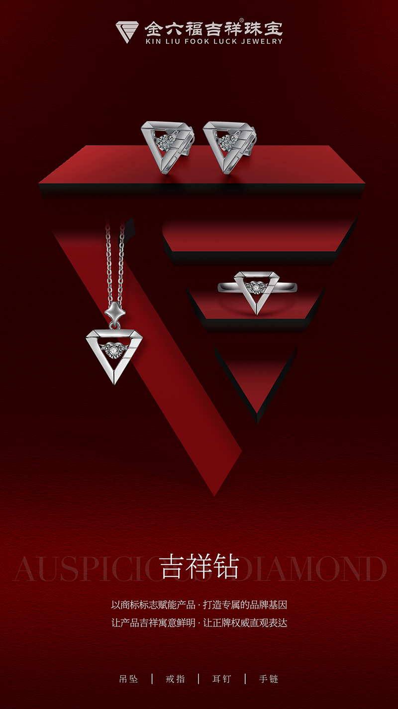 『吉祥钻』以品牌文化“传承爱与幸福”为设计理念,以品牌商标的几何形状幻化成一系列精致典雅的钻石吊坠、戒指、耳钉及手链,寄情于物满足所有消费者的不同需求,将品牌的幸福宣言无限延伸于珠宝产品,以此代表金六福吉祥对天下人的美好祝愿。