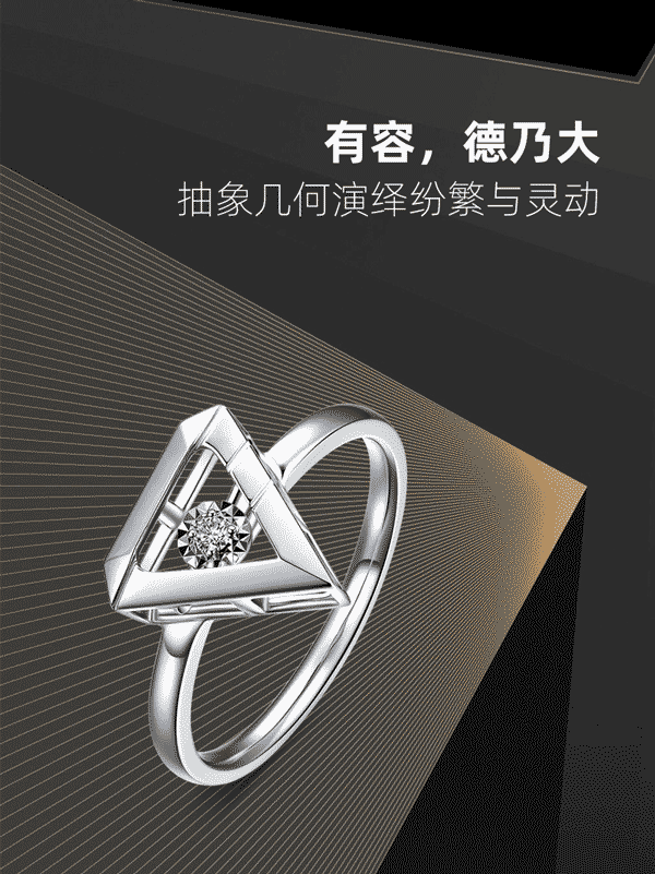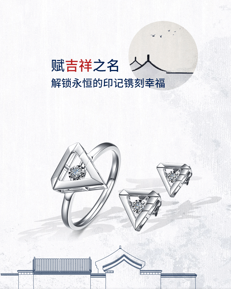 『吉祥钻』以白18K金打造,镶嵌璀璨钻石,散发隽永优雅魅力。几何外形,简洁的材质和纯净颜色,以独特灵动的钻石镶嵌其中,寓意爱情永不停止。从几何到生活,逐步提炼与升华,赋予产品爱的灵魂。